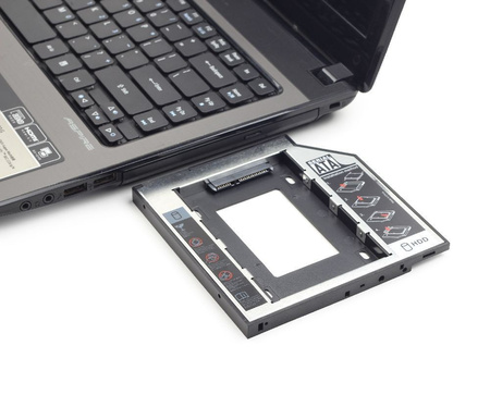 Ramka montażowa MF-95-02 na dysk HDD i SSD przeznaczona do zatok o rozmiarze 5.25". Ta praktyczna cienka szyna montażowa pozwala korzystać Ci z dodatkowego dysku 2,5" Można ją zainstalować w gnieździe na 5.25" w swoim komputerze lub laptopie zamiast napędu DVD-ROM. Niezależna od systemu operacyjnego, nie wymaga sterowników.