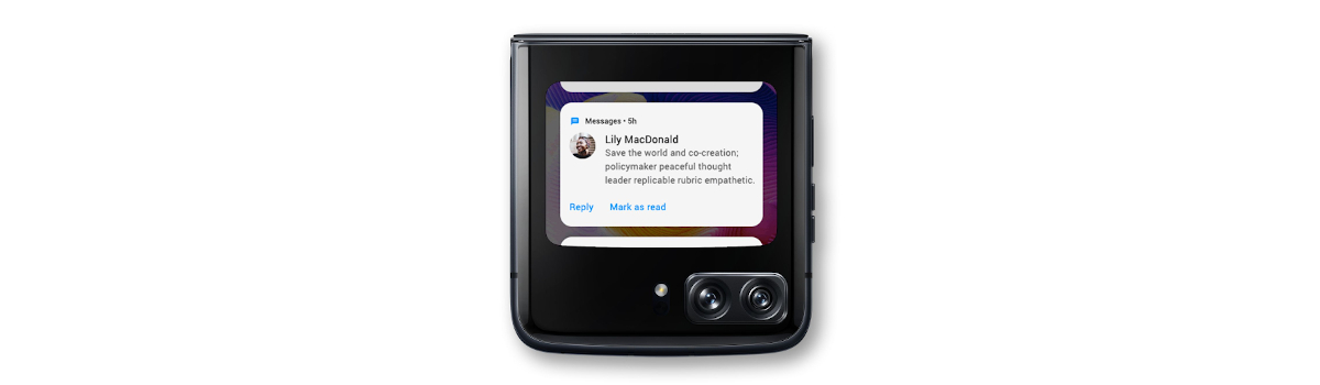 Otwórz klapkę telefonu razr , aby odkryć nowe możliwości. Ekran wewnętrzny Flex View oferuje nowe sposoby interakcji – od pracy na podzielonym ekranie po wideorozmowy bez użycia rąk. Ustaw zawias telefonu pod kątem pozwalającym zrobić selfie bez użycia rąk. Przeprojektowany zawias utrzymuje ustawienie ekranu, więc razr może stać samodzielnie pod różnymi kątami. Postaw telefon tak, by oglądać zawartość bez użycia rąk i wyświetlaj kilka otwartych aplikacji na podzielonym ekranie.